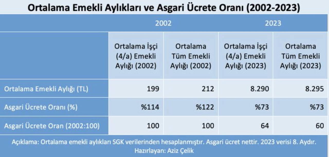 X hesabında yaptığı paylaşımda Çelik, 2002'de asgari ücretin yüzde 22 üzerinde olan ortalama emekli aylığının 2023'te asgari ücretin yüzde 27 altına gerilediğini söyledi.