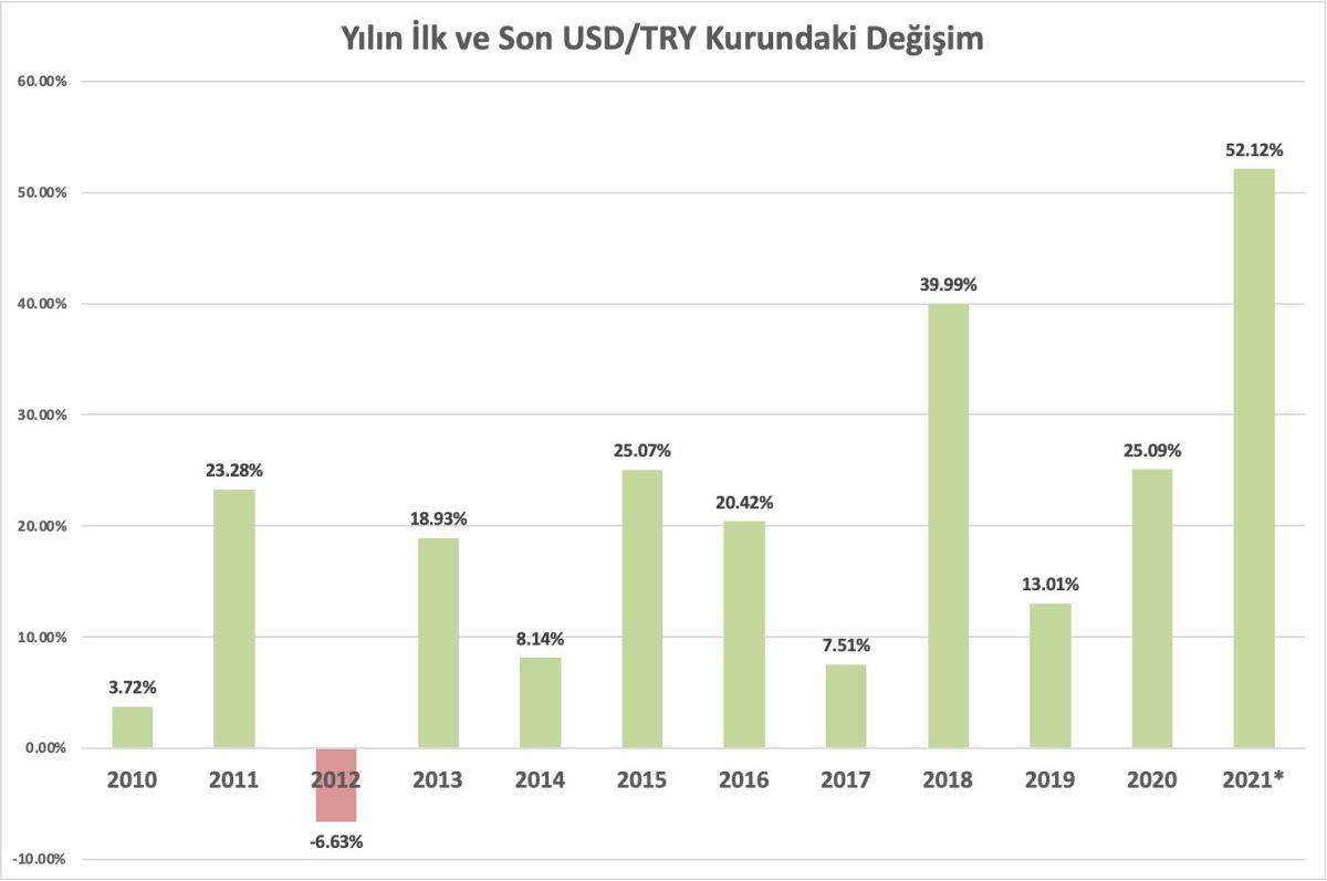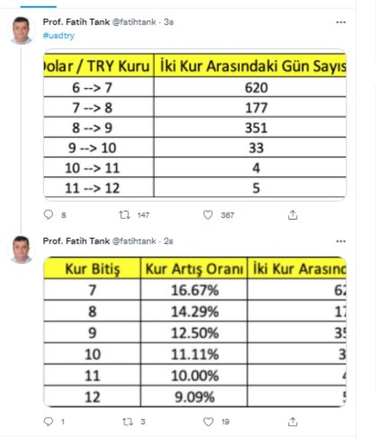 Dolar kurunda yaşanan artışın ardından Ankara Üniversitesi Uygulamalı Bilimler Fakültesi Aktüerya Bilimleri bölümü öğretim üyesi olarak görev yapan Prof. Dr. Fatih Tank, dolar kurundaki artışların ne kadar sürede meydana geldiğini sosyal medya hesabından paylaştı.