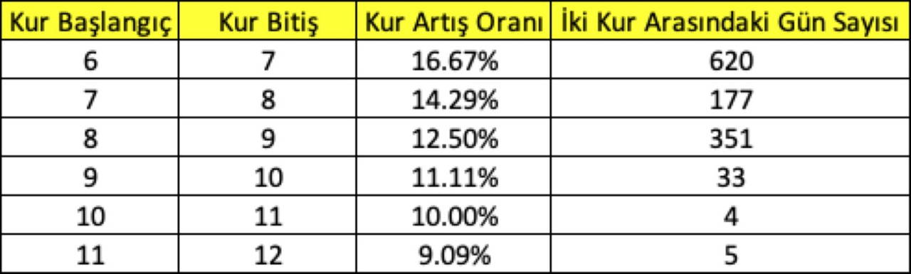 Tank'ın aktardığı verilere göre, dolar kurunun 6 liradan 7 liraya yükselmesi 620 günde, 7 liradan 8 liraya yükselmesi ise 177 günde oldu.
