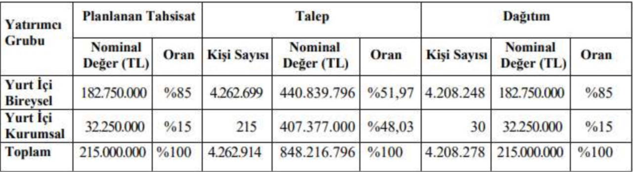 Halka arz fiyatı üzerinden yatırımcı grubu bazında talep ve dağıtım bilgisi aşağıdaki tabloda yer almaktadır.