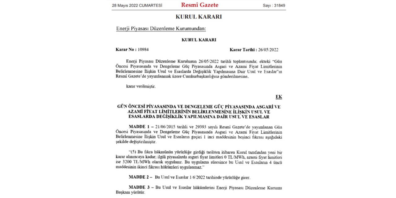 Enerji Piyasası Düzenleme Kurumu (EPDK), 26 Mayıs tarihli kurul toplantısında aldığı "Gün Öncesi Piyasasında ve Dengeleme Güç Piyasasında Asgari ve Azami Fiyat Limitlerinin Belirlenmesine İlişkin Usul ve Esaslarda Değişiklik Yapılması Dair Usul ve Esaslar" Resmi Gazete'de yayımlanarak yürürlüğe girdi.