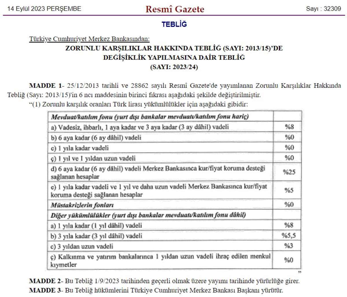 TL vadeli mevduata geçişi teşvik eden bir adım olarak, 6 aya kadar (6 ay dahil) vadeli Kur Korumalı Mevduatlar için zorunlu karşılık oranı yüzde 25’e çıkarıldı. 1 yıla kadar vadeli ve 1 yıl ve daha uzun vadeli olanlar için zorunlu karşılık oranı ise yüzde 5 olarak belirlendi.