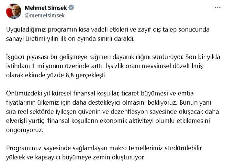 Hazine ve Maliye Bakanı Mehmet Şimşek, "Uyguladığımız programın kısa vadeli etkileri ve zayıf dış talep sonucunda sanayi üretimi yılın ilk 10 ayında sınırlı daraldı. İş gücü piyasası bu gelişmeye rağmen dayanıklılığını sürdürüyor" dedi.