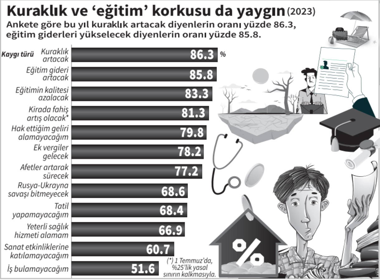 Tüketiciler Birliği’nin dün yayımladığı “EndişeliMİyiz” başlıklı kamuoyu araştırması da bunu teyit ediyor. Zaten Tüketicinin Nabzı Çalışma Grubu Başkanı Merve Kazancı da araştırmanın sonuçlarıyla ilgili şu vurguyu yapıyor: “Tüketici, 2023 yılına ilişkin ekonomik geleceği konusunda derin karamsarlık içinde.”