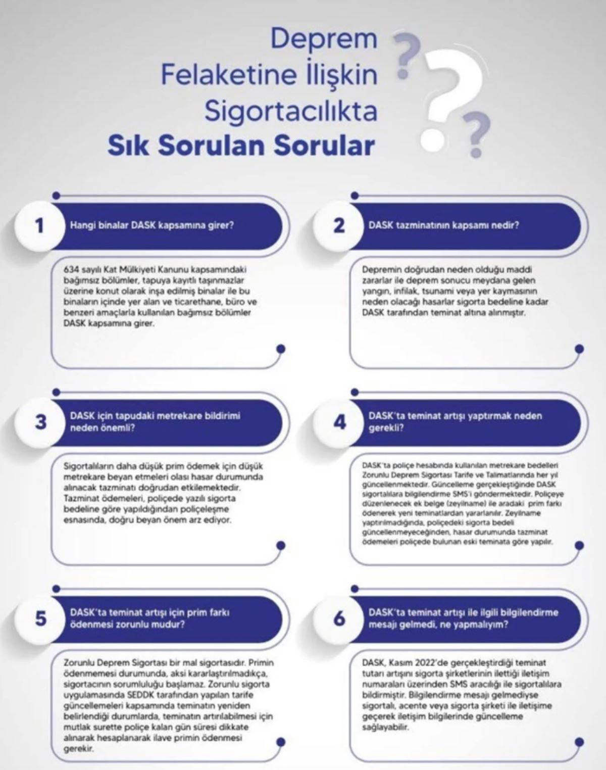 İşte kurumun resmi internet sitesinde yer alan duyuruda, deprem felaketine ilişkin sigortacılıkta sık sorulan sorular ve cevaplar: