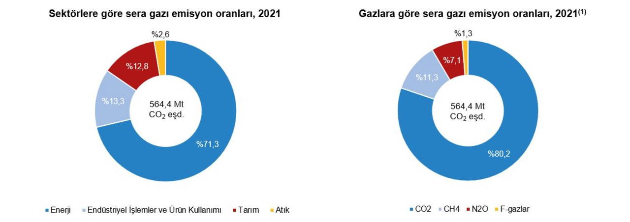 Sera gazı envanteri sonuçlarına göre, 2021 yılı toplam sera gazı emisyonu bir önceki yıla göre yüzde 7,7 artarak 564,4 milyon ton (Mt) CO2 eşdeğeri (eşd.) olarak hesaplandı.