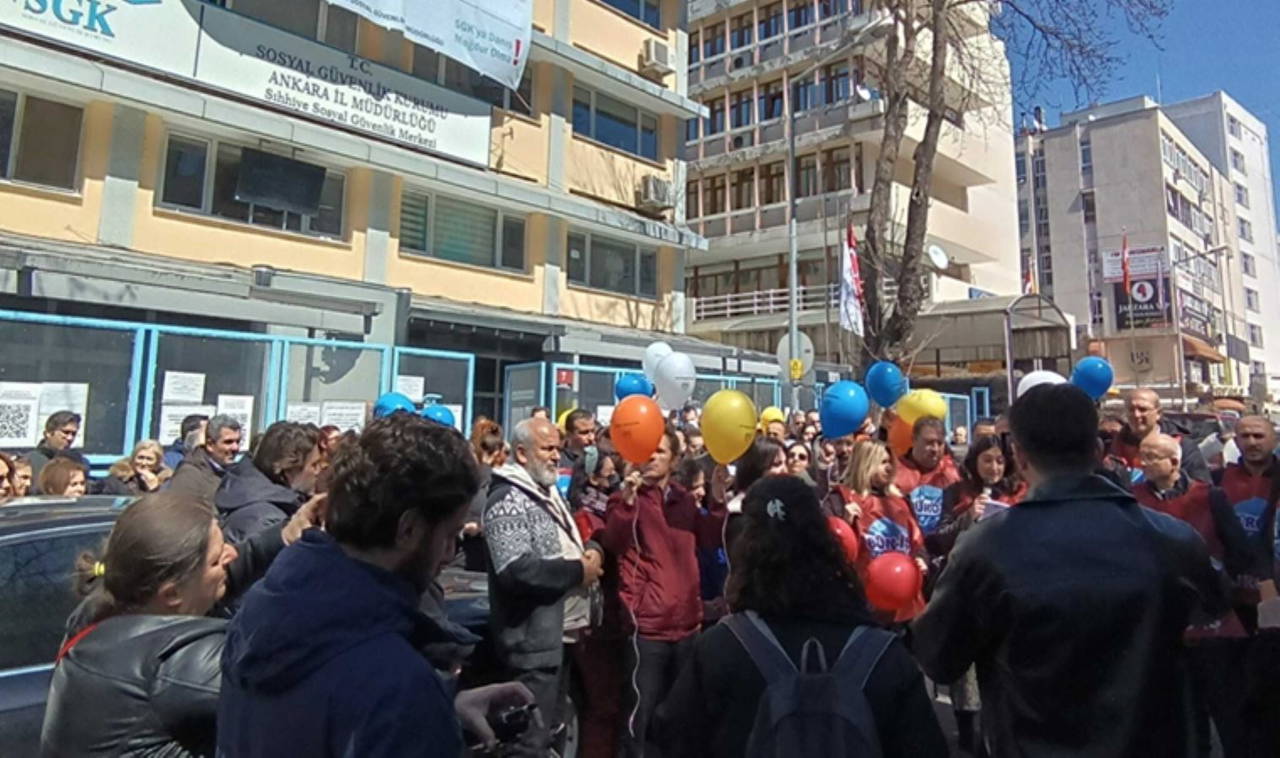 Ankara’da Sıhhiye Sosyal Güvenlik Merkezi binası önünde toplanan çalışanlar, “Yılgın yok, direniş var”, “İkramiye hakkımız, söke söke alırız”, “Zam, zulüm, sefalet, nerede adalet” sloganları attı, taleplerinin yazılı olduğu balonları patlattı.