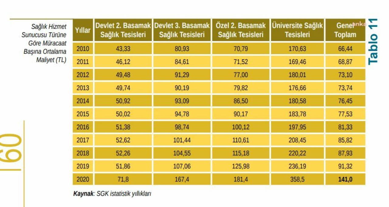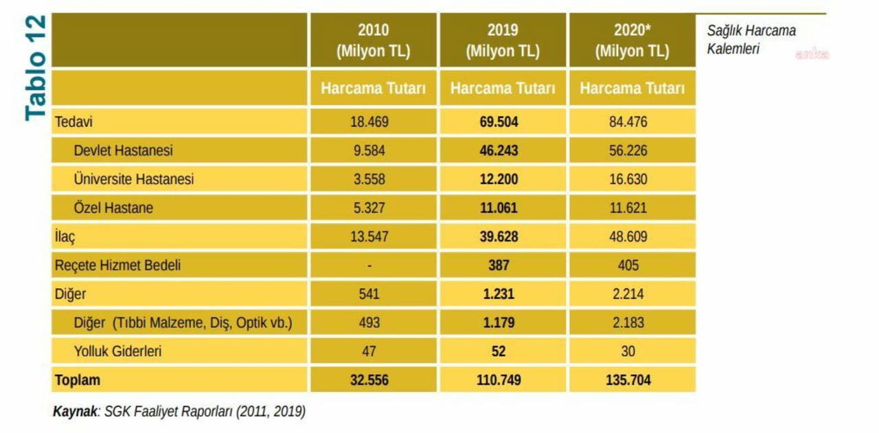 SGK 2010 yılında devlet hastanelerine tedavi için 9 milyar 584 milyon lira, üniversite hastanelerine 3 milyar 558 milyon lira öderken bu miktarlar 2020 yılında sırasıyla 46 milyar 243 milyon lira ve 12 milyar 200 milyona liraya çıktı.