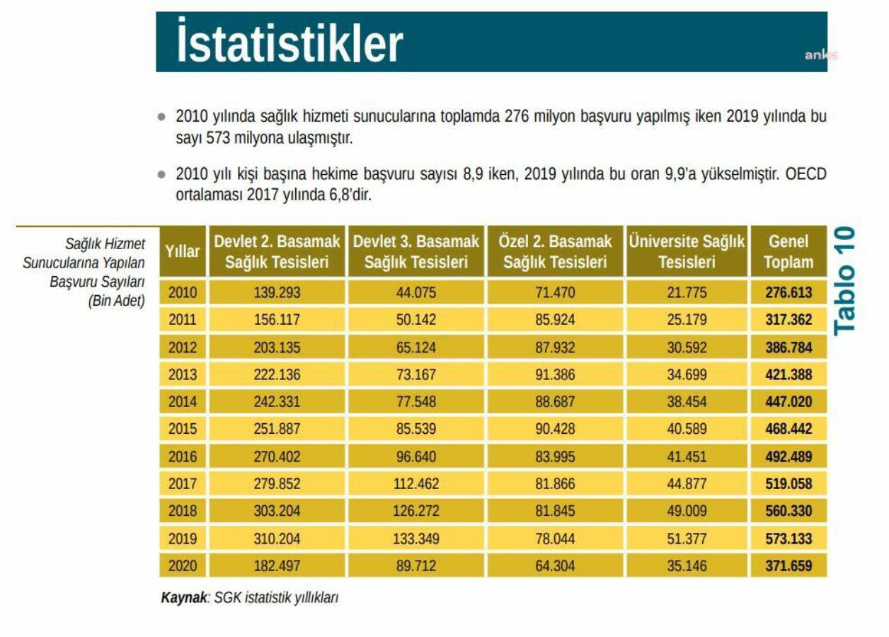 Rapora göre; 2010 yılında sağlık hizmeti sunucularına yapılan toplam başvurusu sayısı 276 milyon kişiyken, bu sayı 2020 yılında 573 milyona ulaştı. Bir hekime 2010 yılında ortalama 8,9 kişi başvuruyordu ve bu sayı 2019 yılında 9,9’a yükseldi. SGK’nin hastanelere sağlık hizmetleri için yaptığı ödeme de 2010 yılına göre yükseldi. Ayrıca SGK’nin devlet hastanelerine oranla, özel hastanelere daha az kişi başvurmasına rağmen daha yüksek para ödediği raporda görüldü.