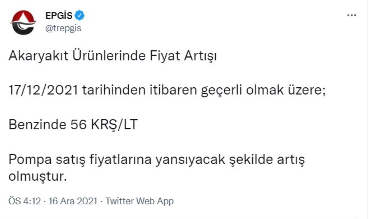 EPGİS tarafından yapılan açıklamada, ''17 Aralık 2021 tarihinden itibaren geçerli olmak üzere; benzinde 56 kuruş pompa satış fiyatlarına yansıyacak şekilde artış olmuştur'' denildi.