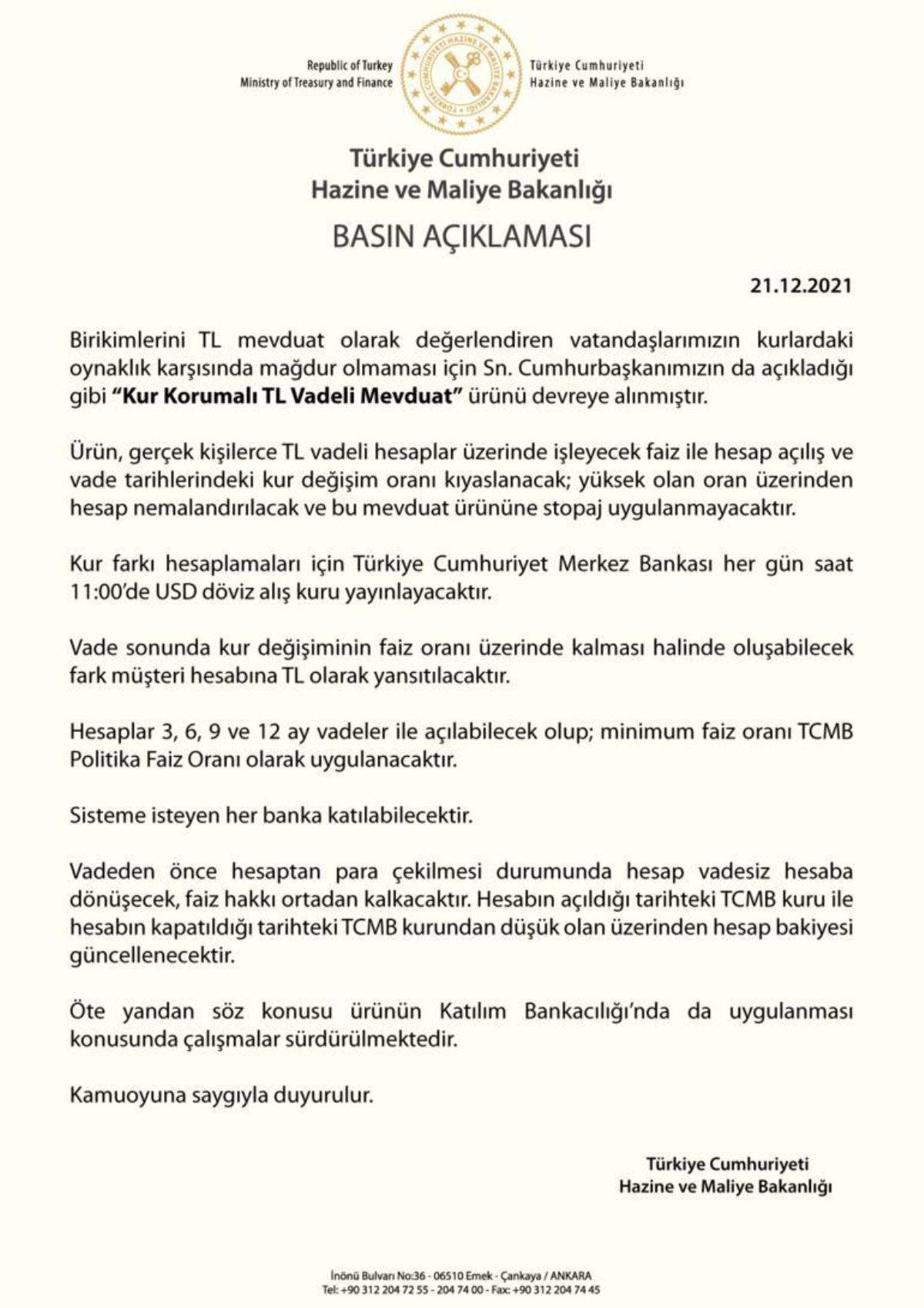 Erdoğan'ın açıklamaları sonrası bakanlıktan yapılan yazılı açıklamada, birikimlerini TL mevduat olarak değerlendiren vatandaşların kurlardaki oynaklık karşısında mağdur olmaması için Cumhurbaşkanı Recep Tayyip Erdoğan'ın da açıkladığı gibi 'Kur Korumalı TL Vadeli Mevduat' ürününün devreye alındığı belirtilip, şöyle denildi: