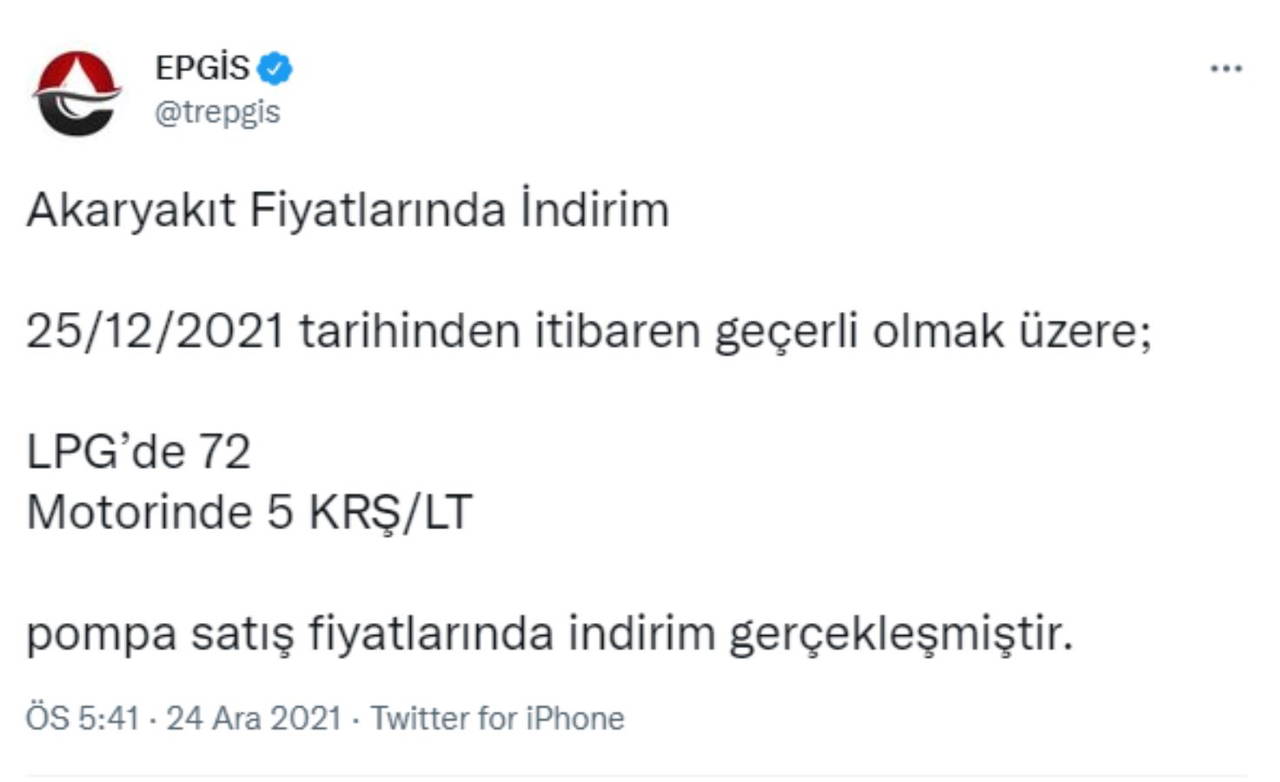 EPGİS tarafından yapılan açıklamada, 25 Aralık 2021 tarihinden itibaren geçerli olmak üzere; LPG’de 72 kuruş, motorinde 5 kuruş indirim yapıldığı duyuruldu.