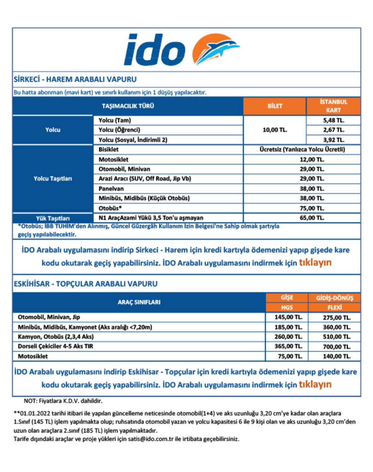 İDO'nun zammı Sirkeci - Harem hattıyla sınırlı değil. Şirketin çalıştırdığı Eskihisar - Topçular arabalı vapur hattına da zam geldi. 2021 yılında otomobiller için 95 lira olan tek yön ücreti yeni tarifeyle 145 liraya yükseldi.