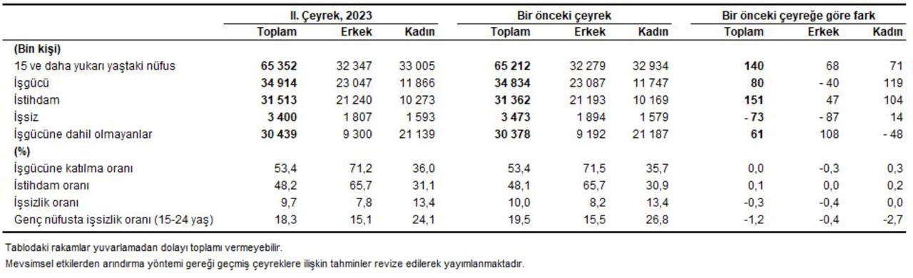 İşgücü 2023 yılı II. çeyreğinde bir önceki çeyreğe göre 80 bin kişi artarak 34 milyon 914 bin kişi, işgücüne katılma oranı ise değişim göstermeyerek yüzde 53,4 olarak gerçekleşti. İşgücüne katılma oranı erkeklerde yüzde 71,2, kadınlarda ise yüzde 36,0 oldu.