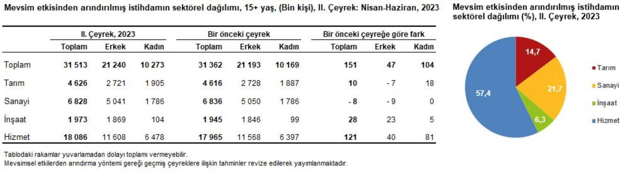 Mevsim etkisinden arındırılmış istihdam edilenlerin sayısı 2023 yılı II. çeyreğinde bir önceki çeyreğe göre sanayi sektöründe 8 bin kişi azalırken, tarım sektöründe 10 bin kişi, inşaat sektöründe 28 bin kişi, hizmet sektöründe 121 bin kişi arttı. İstihdam edilenlerin yüzde 14,7'si tarım, yüzde 21,7'si sanayi, yüzde 6,3'ü inşaat, yüzde 57,4'ü ise hizmet sektöründe yer aldı.