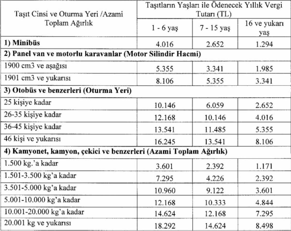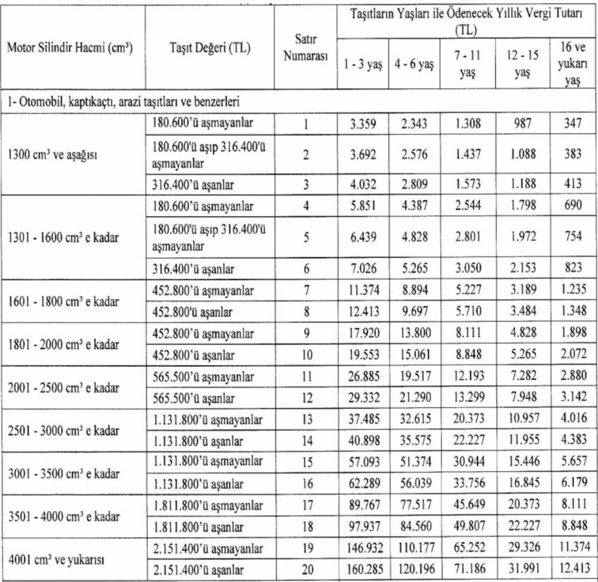 Hazine ve Maliye Bakanlığı'na bağlı Gelir İdaresi Başkanlığı tarafından yapılan Motorlu Taşıtlar Vergisi Genel Tebliği'nde yer alan 2024 yılında ödenecek Motorlu Araç Vergisi (MTV) tarifesi şu şekilde: