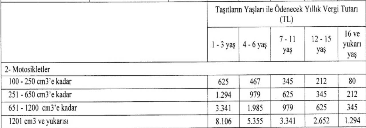 MOTOSİKLET TARİFESİ