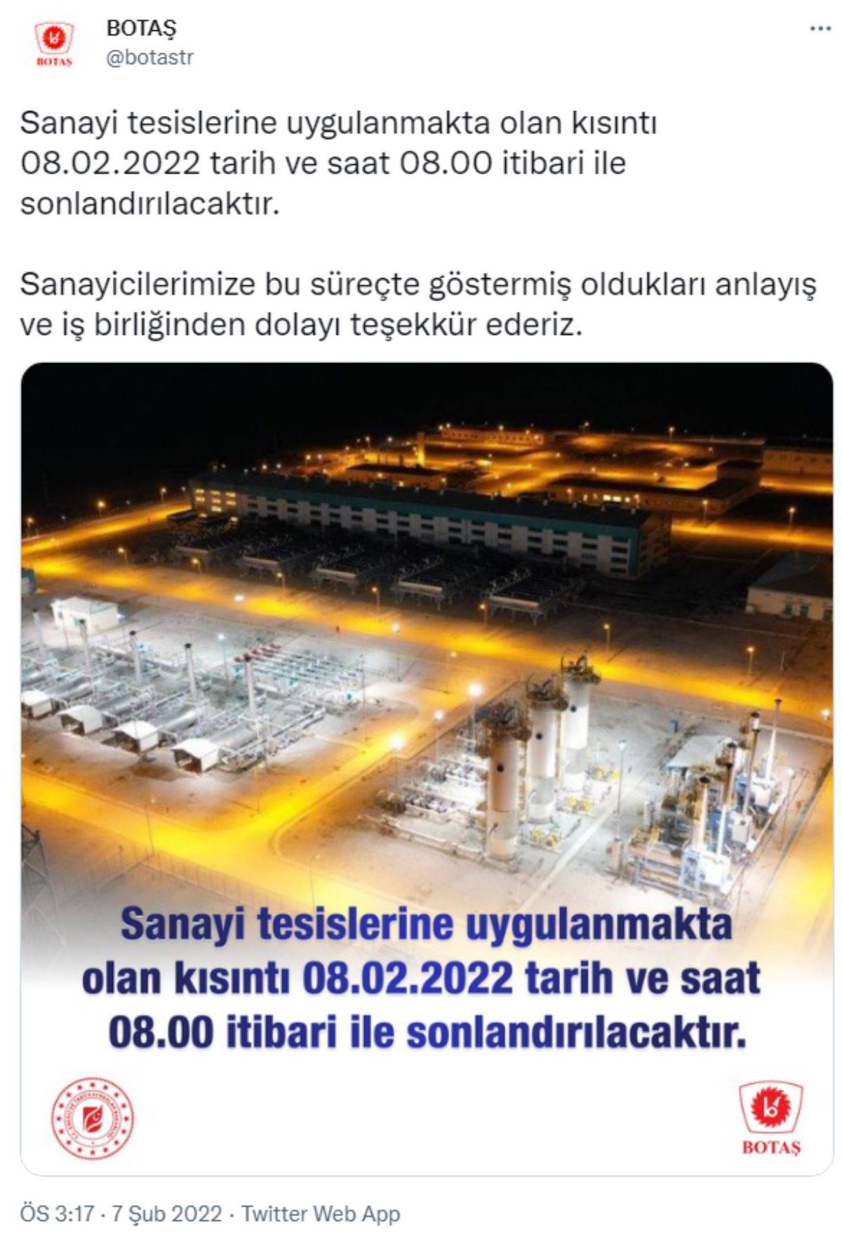 Yaşanan doğalgaz krizinin ardından BOTAŞ tarafından yapılan açıklamada, ''Sanayi tesislerine uygulanmakta olan kısıntı 8 Şubat 2022 tarih ve saat 08.00 itibari ile sonlandırılacaktır. Sanayicilerimize bu süreçte göstermiş oldukları anlayış ve iş birliğinden dolayı teşekkür ederiz'' denildi.