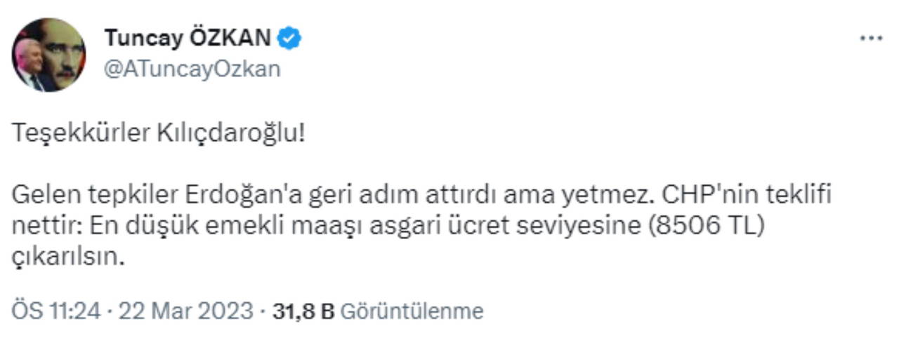 Erdoğan'ın açıklamasının ardından muhalefetten tepki gelirken CHP İzmir Milletvekili Tuncay Özkan, sosyal medya hesabından yaptığı paylaşımda, "Teşekkürler Kılıçdaroğlu! Gelen tepkiler Erdoğan'a geri adım attırdı ama yetmez. CHP'nin teklifi nettir: En düşük emekli maaşı asgari ücret seviyesine (8506 TL) çıkarılsın" ifadelerini kullandı.