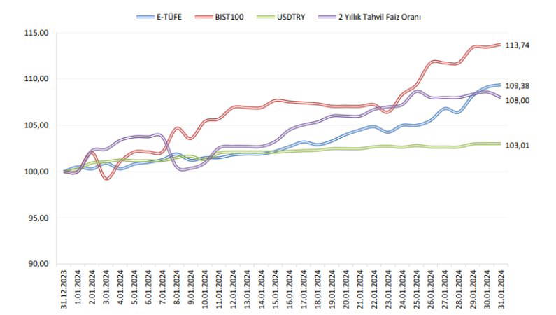 Ocak 2024, ENAGrup Tüketici Fiyat Endeksi (E-TÜFE) seyri günlük bazda BIST100, ABD Doları döviz kuru ve Faiz oranı (2 yıllık devlet tahvili) göstergelerinin günlük verileri aşağıdaki tabloda birlikte gösterilmiştir.