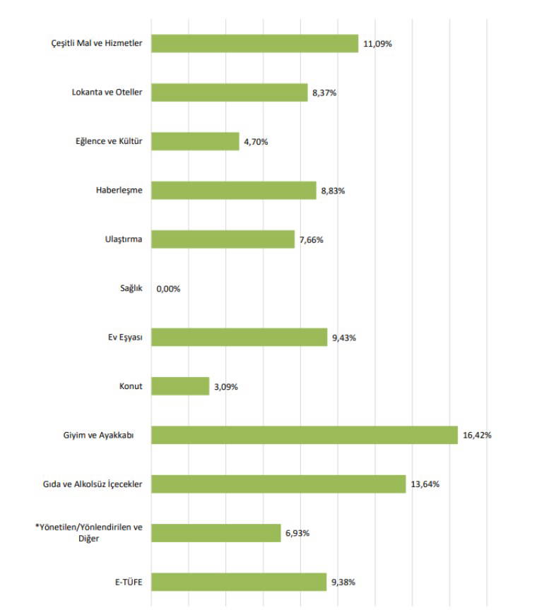 TÜİK alt grupları gösterge olarak alındığında en az aylık artış yüzde 0,00 ile Sağlık en fazla yükseliş ise yüzde 16,42 ile Giyim ve Ayakkabı kaleminde gerçekleşmiştir.
