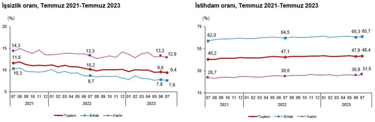 Hanehalkı İşgücü Araştırması sonuçlarına göre; 15 ve daha yukarı yaştaki kişilerde işsiz sayısı 2023 yılı Temmuz ayında bir önceki aya göre 38 bin kişi azalarak 3 milyon 291 bin kişi oldu. İşsizlik oranı ise 0,2 puan azalarak yüzde 9,4 seviyesinde gerçekleşti. İşsizlik oranı erkeklerde yüzde 7,6 iken kadınlarda yüzde 12,9 olarak tahmin edildi.