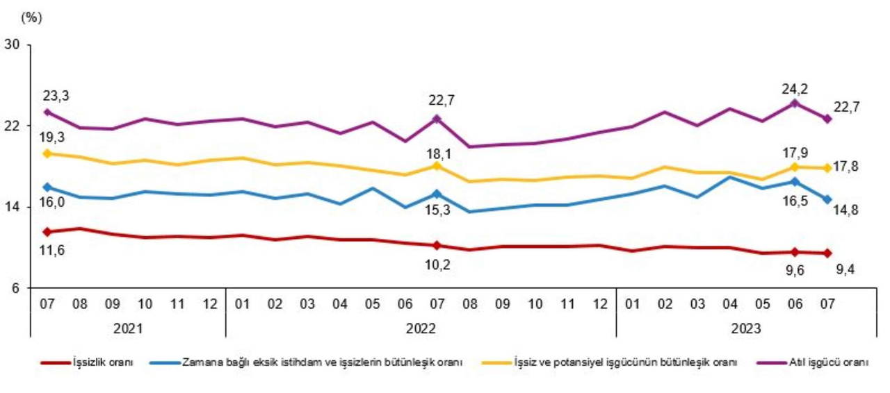 Zamana bağlı eksik istihdam, potansiyel işgücü ve işsizlerden oluşan atıl işgücü oranı 2023 yılı Temmuz ayında bir önceki aya göre 1,5 puanlık azalış ile yüzde 22,7 oldu. Zamana bağlı eksik istihdam ve işsizlerin bütünleşik oranı yüzde 14,8 iken işsiz ve potansiyel işgücünün bütünleşik oranı yüzde 17,8 olarak tahmin edildi.