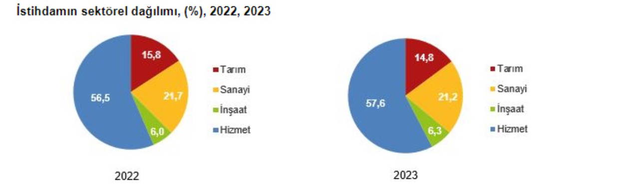 2023 yılında 4 milyon 695 bin kişi tarım sektöründe, 6 milyon 711 bin kişi sanayi sektöründe, 1 milyon 997 bin kişi inşaat sektöründe, 18 milyon 230 bin kişi hizmet sektöründe istihdam edildi. Bir önceki yıl ile karşılaştırıldığında istihdam edilenlerin sayısı tarım sektöründe 171 bin kişi azalırken, sanayi sektöründe 48 bin, inşaat sektöründe 151 bin, hizmet sektöründe 852 bin kişi arttı.