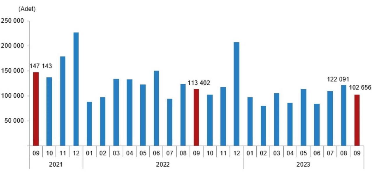 Buna göre, Türkiye genelinde konut satışları eylül ayında bir önceki yılın aynı ayına göre yüzde 9,5 azalarak 102 bin 656 oldu.