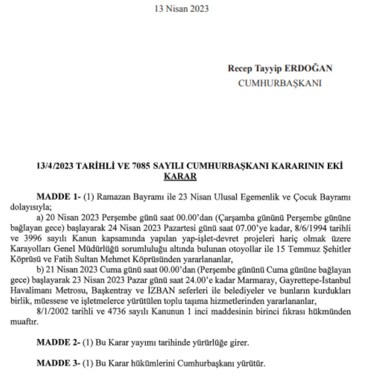 Ramazan Bayramı'nda köprü ve otoyollardan geçişin ücretsiz olmasına ilişkin Cumhurbaşkanı kararı, Resmi Gazete'de yayımlandı.