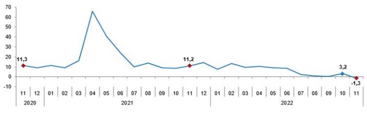2022 yılı Kasım ayında madencilik ve taşocakçılığı sektörü endeksi bir önceki yılın aynı ayına göre yüzde 8,6, imalat sanayi sektörü endeksi yüzde 0,4 ve elektrik, gaz, buhar ve iklimlendirme üretimi ve dağıtımı sektörü endeksi yüzde 7,9 azaldı.