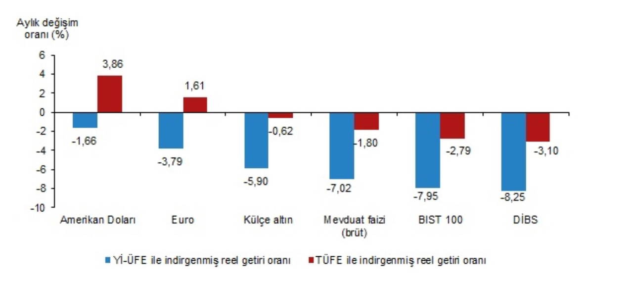 Yİ-ÜFE ile indirgendiğinde; yatırım araçlarından Euro yüzde 3,79, külçe altın yüzde 5,90, mevduat faizi (brüt) yüzde 7,02, BIST 100 endeksi yüzde 7,95 ve Devlet İç Borçlanma Senetleri (DİBS) yüzde 8,25 oranlarında yatırımcısına kaybettirdi. TÜFE ile indirgendiğinde Euro yüzde 1,61 oranında yatırımcısına reel getiri sağlarken, külçe altın yüzde 0,62, mevduat faizi (brüt) yüzde 1,80, BIST 100 endeksi yüzde 2,79 ve DİBS yüzde 3,10 oranlarında yatırımcısına kaybettirdi.