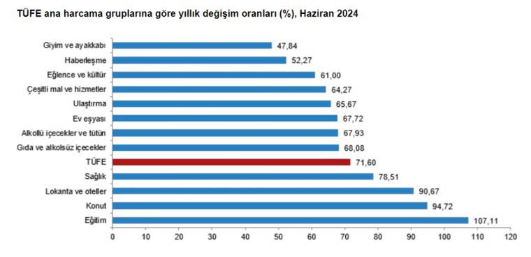 Bir önceki yılın aynı ayına göre en az artış gösteren ana grup yüzde 47,84 ile Giyim ve Ayakkabı oldu. Buna karşılık, bir önceki yılın aynı ayına göre artışın en yüksek olduğu ana grup ise yüzde 107,11 ile Eğitim oldu.