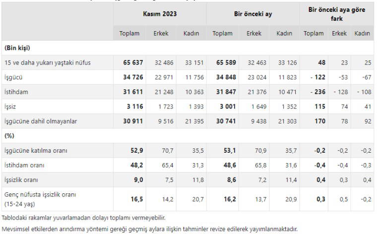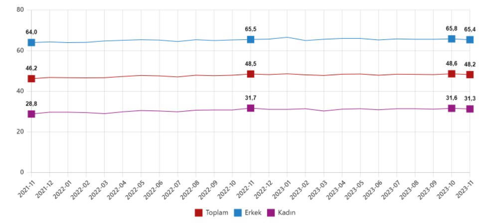 İşgücü 2023 yılı Kasım ayında bir önceki aya göre 122 bin kişi azalarak 34 milyon 726 bin kişi, işgücüne katılma oranı ise 0,2 puan azalarak yüzde 52,9 olarak gerçekleşti. İşgücüne katılma oranı erkeklerde yüzde 70,7 iken kadınlarda yüzde 35,5 oldu.