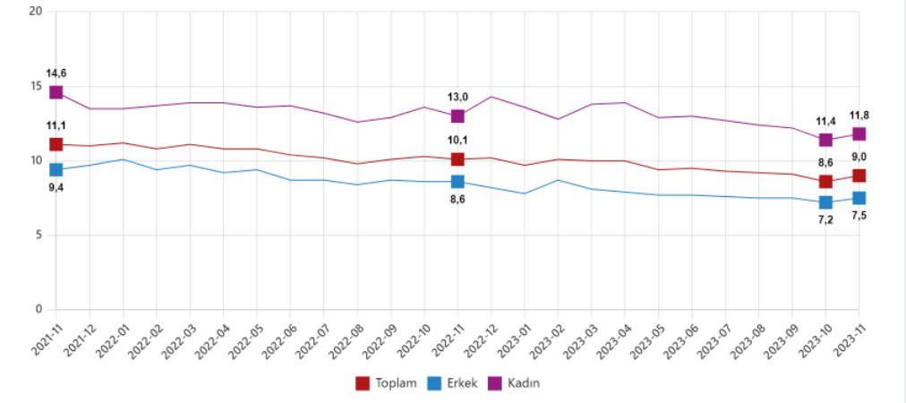 Mevsim etkisinden arındırılmış işsizlik oranı, Kasım 2021 - Kasım 2023