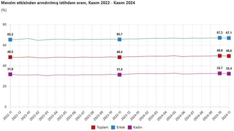 İstihdam edilenlerin sayısı 2024 yılı Kasım ayında bir önceki aya göre 168 bin kişi azalarak 32 milyon 748 bin kişi, istihdam oranı ise 0,2 puan azalarak yüzde 49,6 oldu. Bu oran erkeklerde yüzde 67,1 iken kadınlarda yüzde 32,4 olarak gerçekleşti.