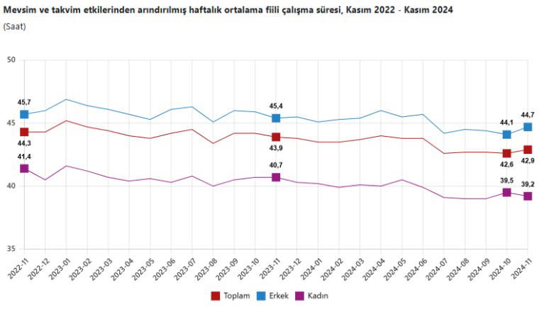 İstihdam edilenlerden referans döneminde işbaşında olanların, mevsim ve takvim etkilerinden arındırılmış haftalık ortalama fiili çalışma süresi 2024 yılı Kasım ayında bir önceki aya göre 0,3 saat artarak 42,9 saat olarak gerçekleşti.