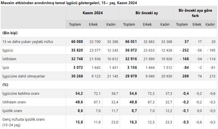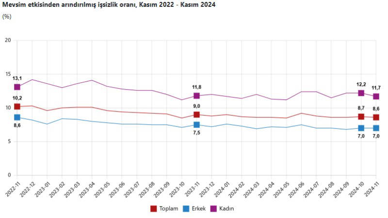 Türkiye İstatistik Kurumu 2024 Kasım ayına ilişkin işsizlik verilerini yayımladı. Yayımlanan verilere göre kasım ayı mevsim etkisinden arındırılmış işsizlik oranı yüzde 8,6 seviyesinde gerçekleşti.