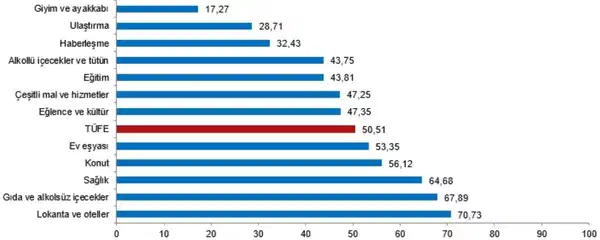 Ana harcama grupları itibariyle Mart'ta en yüksek yıllık artış yüzde 70,73 ile lokanta ve otellerde yaşandı. Lokanta ve oteller grubunu yüzde 67,89 ile gıda ve alkolsüz içecekler, yüzde 64,68 ile sağlık grubu takip etti.