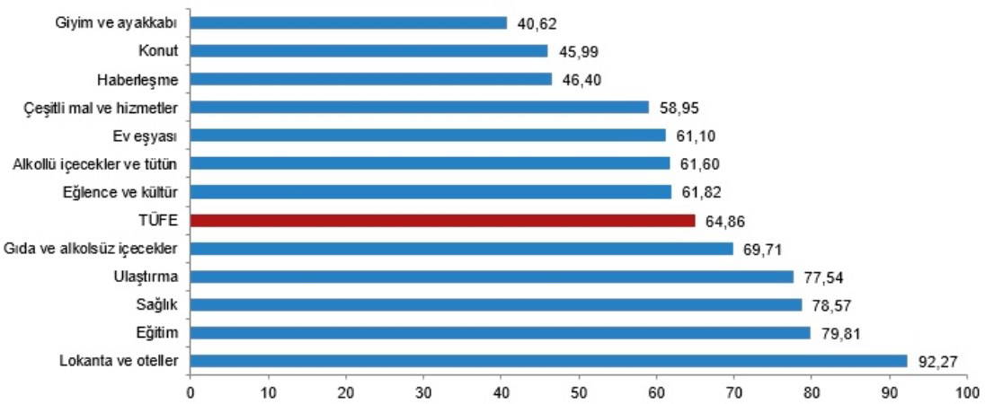 Bir önceki yılın aynı ayına göre en az artış gösteren ana grup yüzde 40,62 ile giyim ve ayakkabı oldu. Buna karşılık, bir önceki yılın aynı ayına göre artışın en yüksek olduğu ana grup ise yüzde 92,27 ile lokanta ve oteller oldu.