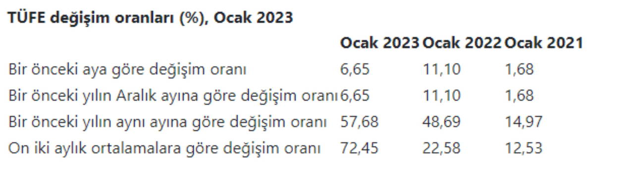 Türkiye İstatistik Kurumu (TÜİK) verilerine göre, ocak ayında tüketici fiyatları bir önceki yılın aynı dönemine göre yüzde 57,68 arttı. Aylık enflasyon ise yüzde 6,65 olarak açıklandı. Böylelikle aylık enflasyon serisi 49. aya çıktı. Aynı zamanda ocak ayında görülen aylık enflasyon son 9 ayın en yüksek enflasyonu oldu.