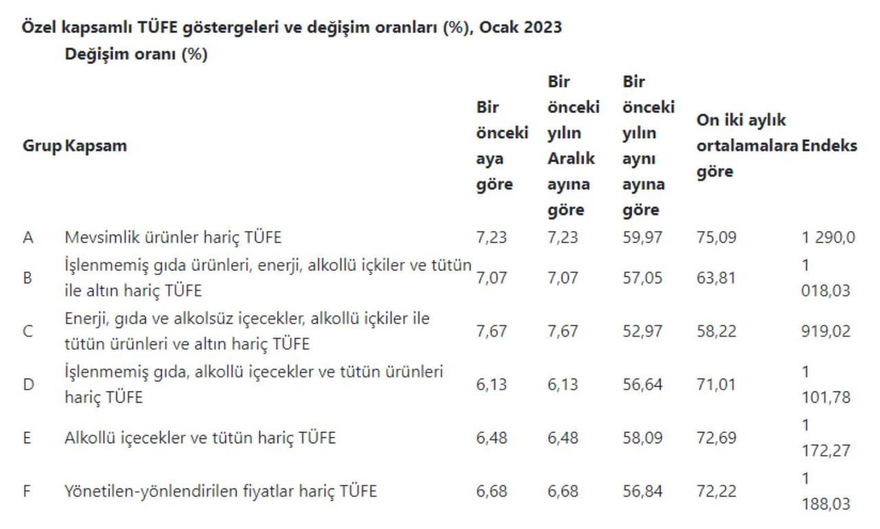 İşlenmemiş gıda ürünleri, enerji, alkollü içkiler ve tütün ile altın hariç TÜFE'deki değişim, 2023 yılı Ocak ayında bir önceki aya göre yüzde 7.07, bir önceki yılın aralık ayına göre yüzde 7.07, bir önceki yılın aynı ayına göre yüzde 57.05 ve on iki aylık ortalamalara göre yüzde 63.81 olarak gerçekleşti.