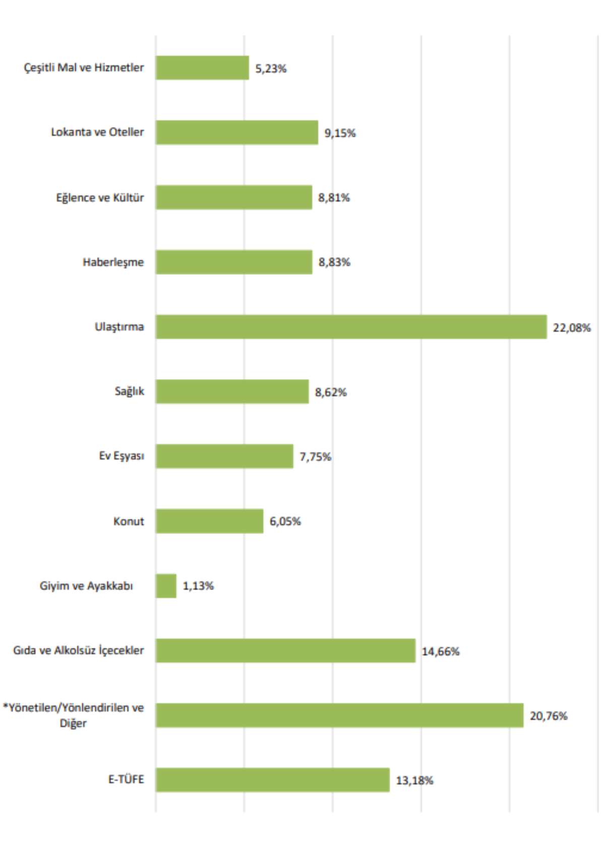 TÜİK alt grupları gösterge olarak alındığında en az aylık artış yüzde 1.13 ile Giyim ve Ayakkabı en fazla yükseliş ise yüzde 22.08 ile Ulaştırma kaleminde gerçekleşmiştir.