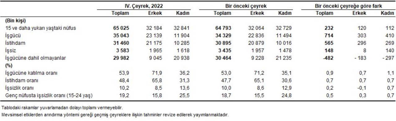 İşgücü 2022 yılı 4. çeyreğinde bir önceki çeyreğe göre 714 bin kişi artarak 35 milyon 43 bin kişi, işgücüne katılma oranı ise 0,9 puanlık artış ile yüzde 53,9 olarak gerçekleşti. İşgücüne katılma oranı erkeklerde yüzde 71,9, kadınlarda ise yüzde 36,2 oldu.