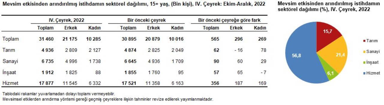 Mevsim etkisinden arındırılmış istihdam edilenlerin sayısı 2022 yılı IV. çeyreğinde bir önceki çeyreğe göre tarım sektöründe 62 bin kişi, sanayi sektöründe 90 bin kişi, inşaat sektöründe 57 bin kişi, hizmet sektöründe 356 bin kişi arttı. İstihdam edilenlerin yüzde 15,7’si tarım, yüzde 21,4’ü sanayi, yüzde 6,1’i inşaat, yüzde 56,8’i ise hizmet sektöründe yer aldı.
