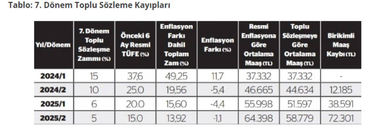 Yüksek enflasyon dönemlerinde toplu sözleşme zam formülü hayati öneme sahip. 7. dönem toplu sözleşmesinde öngörülen zam formülüne göre toplu sözleşme zamları (enflasyonun yüksek çıkması durumunda) enflasyondan düşülüyor. Öte yandan her altı ayda bir toplu sözleşme zam oranı da kademeli olarak düşüyor (yüzde 15, yüzde 10, yüzde 6, yüzde 5 gibi). Böylece bir önceki altı aylık dönemde uygulanan toplu sözleşme zam oranı (daha yüksek bir oran) geçen 6 ayın resmi enflasyonundan düşülüyor.