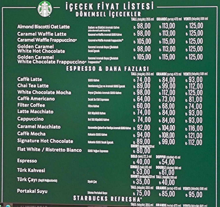 Sosyal medyada dolaşan listeye göre, en düşük içecek 35 TL ile çay oldu.