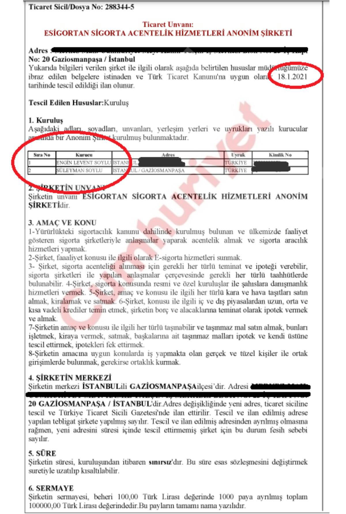 Şirketin faaliyet konusu içinde “e-sigorta hizmetleri sunmak” başlığı yer aldı. Esigortan Sigorta Acentelik Hizmetleri Anonim Şirketi’nin kuruluş sermayesi ise 100 bin TL olarak belirlendi. Şirket hisseleri, Süleyman Soylu ve oğlu arasında eşit olarak bölündü.