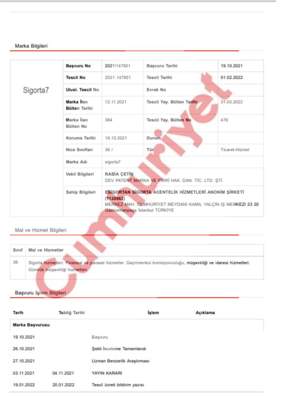 “esigortan.net" adlı bir şirketin kurulması ile ilgili olarak da halihazırda ticari herhangi bir faaliyet veya etkinlik sözkonusu değildir.”