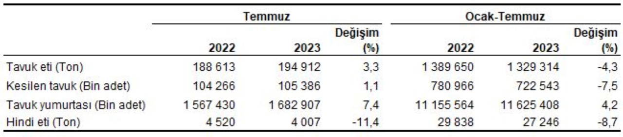 Temmuz ayında bir önceki yılın aynı ayına göre tavuk yumurtası üretimi yüzde 7,4, tavuk eti üretimi yüzde 3,3 ve kesilen tavuk sayısı yüzde 1,1 artarken; hindi eti üretimi yüzde 11,4 azaldı.